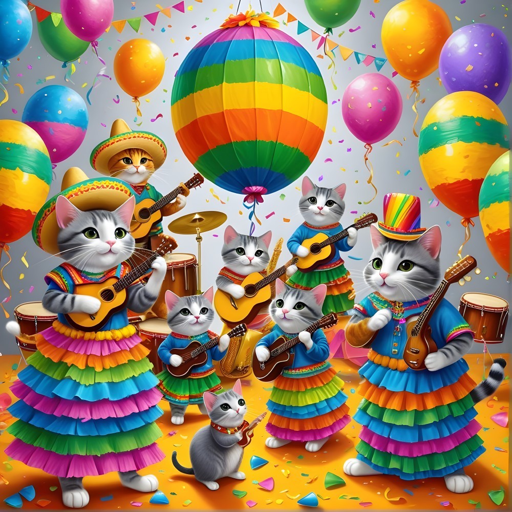 Prompt: Please paint a fantastic Cinco de Mayo fiesta party with cats wearing colorful Mexican clothes partying around green, orange, and yellow pinatas. In the background, we see a band of small gray mice playing guitar, drums, and trumpet. Colorful confetti. Super festive and joyful vibe.